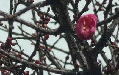 校長室前の紅梅が、一輪咲いていました。