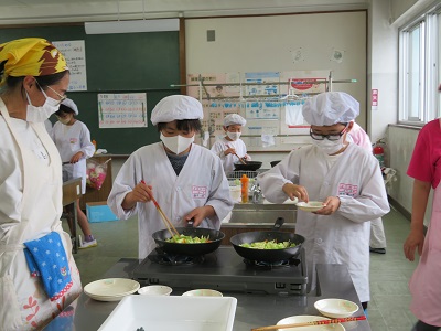 6年生は、家庭科の「できることを増やしてクッキング」の学習で、手早くできる野菜炒めを作りました。