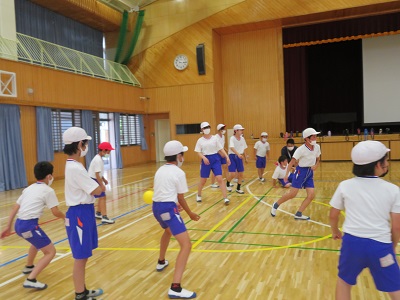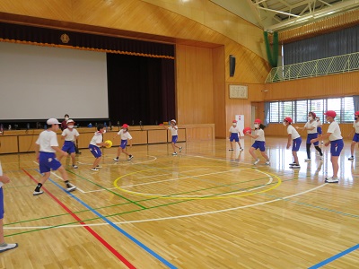 赤と白に分かれて試合をしている様子です。学年混合でチームを組み、ボールを2つ使ってゲームをしました。チームで声を掛け合いながら楽しく活動できました。
