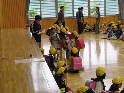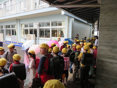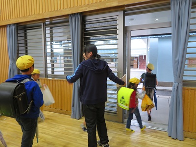 1年生がまだ慣れていないので、並ぶところや帰る場所を確認しながら行いました。