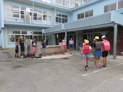 この日は、西昇降口では6年生が、東昇降口では1年生と5年生があいさつ運動を行っていました。