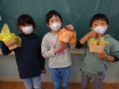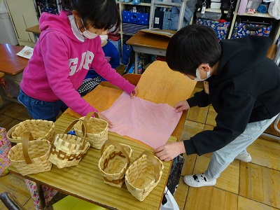 2年生は、卒業式で使う胸花を入れるかごの装飾を行いました。