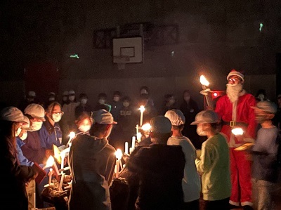 マリンキャンドルは、スポーツ館を真っ暗にしてキャンドルに明かりを灯す、とても厳かな活動です。