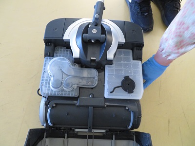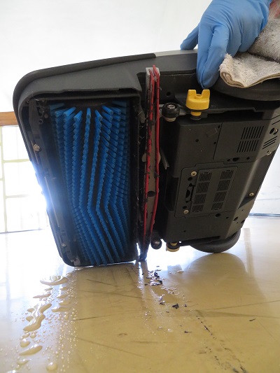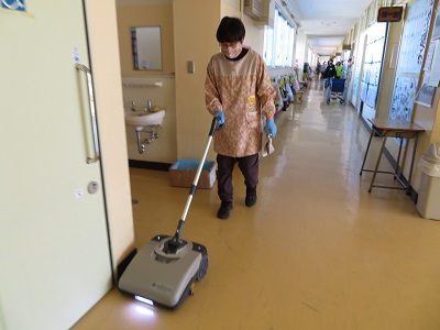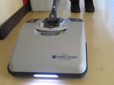 この床清掃機を使い、公仕さんが廊下をきれいにしてくれています。