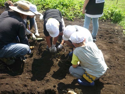 晴天が続いたので、畑の土が硬く、みんなで力を合わせてジャガイモを掘り出します。
