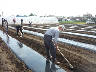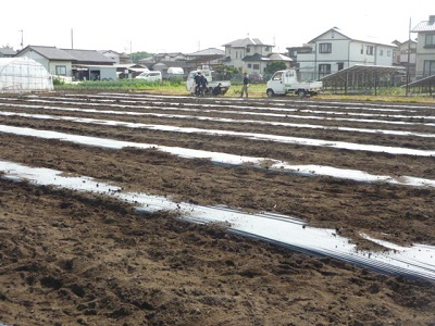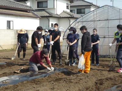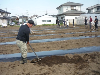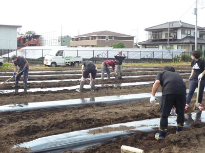 ボランティアの方と一緒に、農園(さつま芋畑)に畝立てをし、雑草が生えないようにマルチを掛けました。