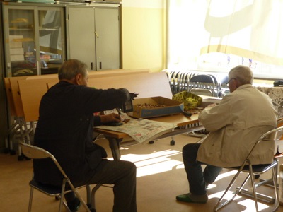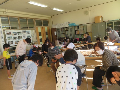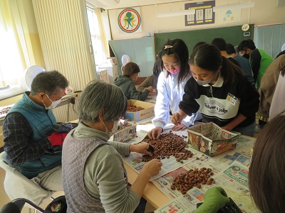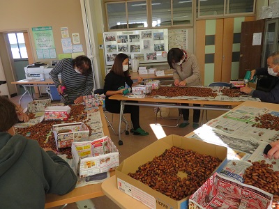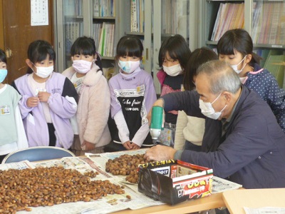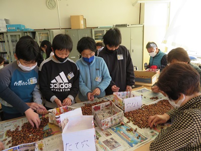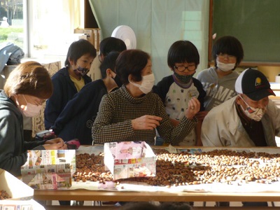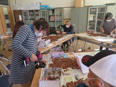 1年生が公園で取ってきて、商工会女性部の方が虫が出てこないように煮てくれたドングリを、ボランティアの方々が穴を空けてくれました。