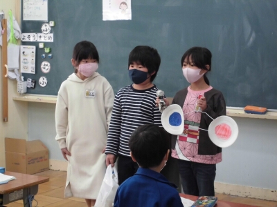 おもちゃ作りを通して行う2年生と1年生の交流活動の代わりに、2年生が作った手作りおもちゃを1年生にプレゼントしました。