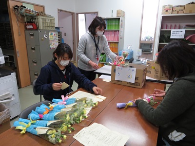 先生方は、児童が書いたメッセージカードを花束に貼りました。