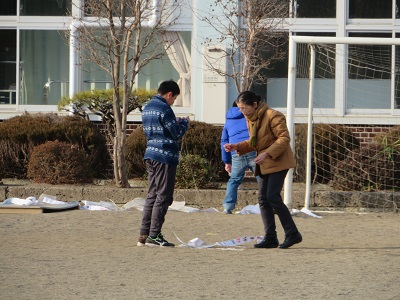 ボランティアの方の御協力でやっこだこが完成し、たこ揚げをすることができました。