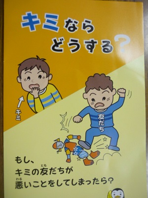 毎年強化月間の7月に呼び掛けのチラシとグッズを児童に分けています。