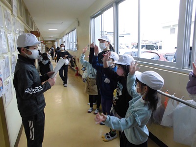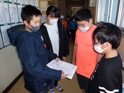 また、週番活動の引き継ぎも行われました。12月から、6年生に教えてもらいながら国旗を揚げ下げする仕事を行ってきましたが、見習い期間が終わり、今週の木曜日から5年生の本格的な活動がスタートしました。