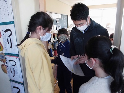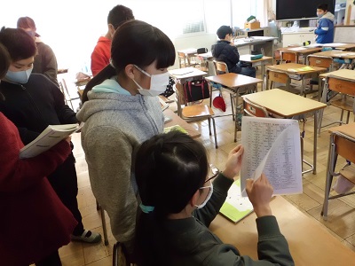 自分たちで考えた清掃分担を担当の先生に確認してもらっています。