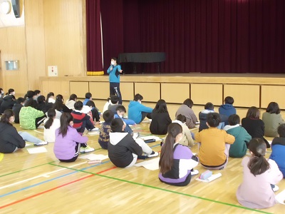 清掃ファイルを引き継いでいる様子です。5年生は、真剣な表情で6年生の話を聞いています。