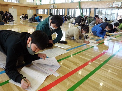 全体指導の様子です。緊張した様子で先生の話を聞いています。