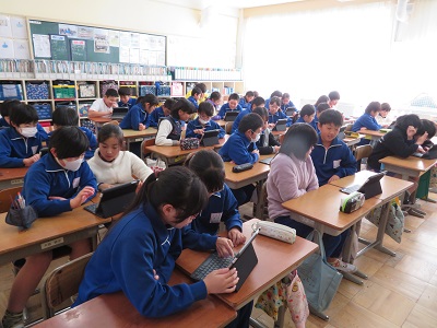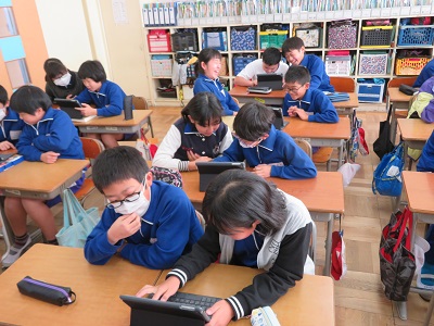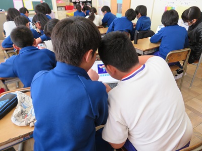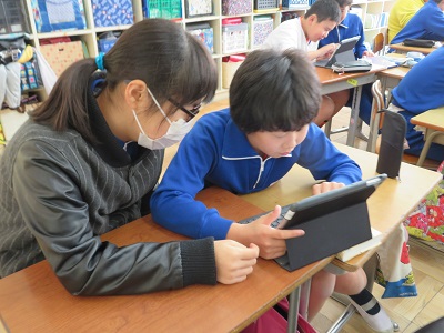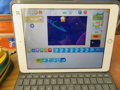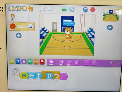 背景を選び、ネコのキャラクターの動きをプログラミングしていきます。タブレットが、2人で1台なので、協力してタブレットを操作していました。授業が終わる頃には、自由に背景を選び、ネコのキャラクターを楽しそうに動かしていました。
