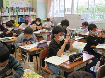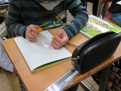 5年生が虫眼鏡を使って、菜の花を観察しています。