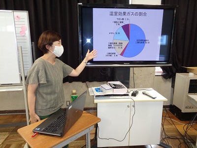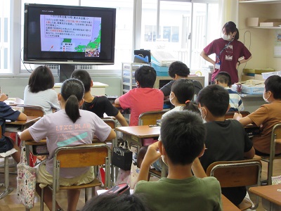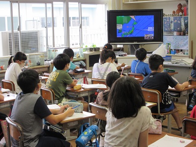 理科「台風と気象情報」の学習をしました。7月28日には気象予報士の宇賀神美代子さんに来ていただき、気象について詳しい話をしていただきました。