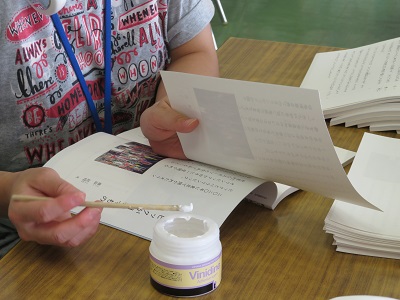 3年生の国語下の教科書に訂正があり、本の修理になれている図書ボランティアの方にお願いしてやってもらいました。