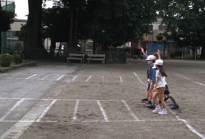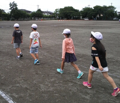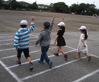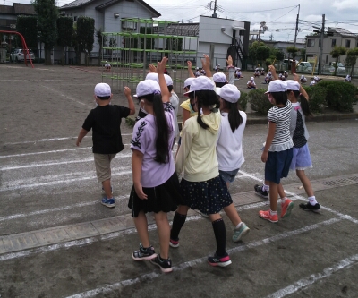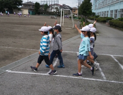校庭の模擬道路で、グループで横断歩道を渡る練習を行いました。
