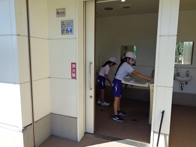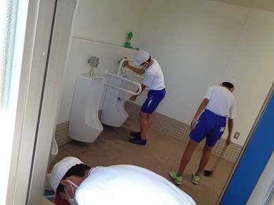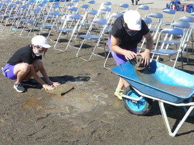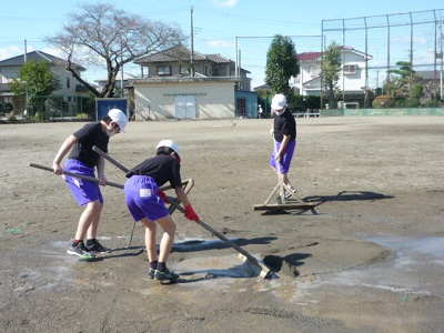 前々日に雨が降り校庭に水たまりができてしまったので、スポンジで水を吸ったり、トンボを使って地面を平らにしたりしました。