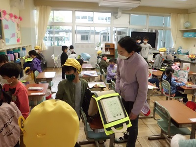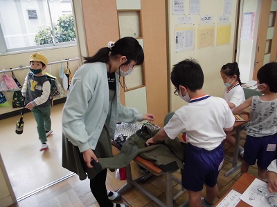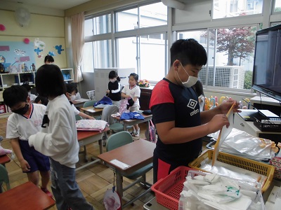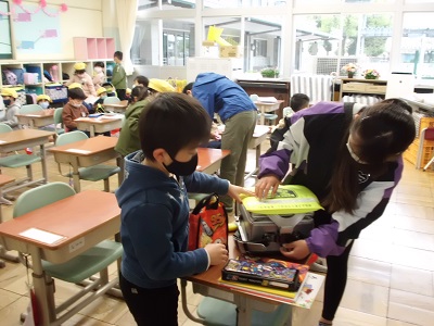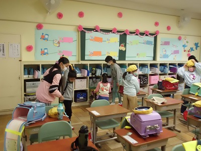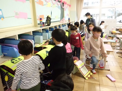 ランドセルをロッカー箱にしまうことも一苦労なようです。6年生のサポートを受けながら、頑張って片付けをしています。