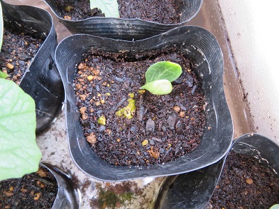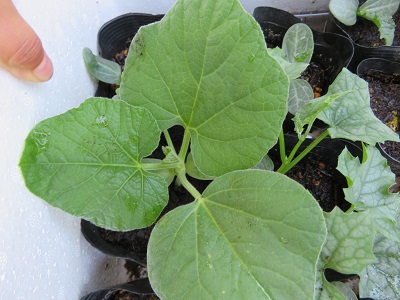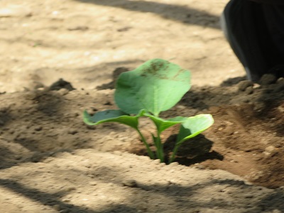 ゴールデンウィーク明けに、ポットに蒔いたヘチマの種から芽が出て、本葉が出てきたので、中庭に植え替えました。