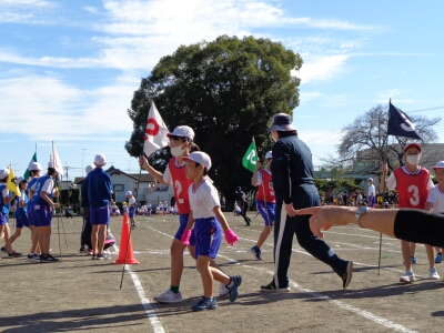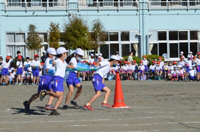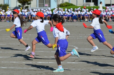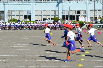 1年生の徒競走「かけっこ」では、男女別に走りました。みんな、最後まで力いっぱい走り切りました。