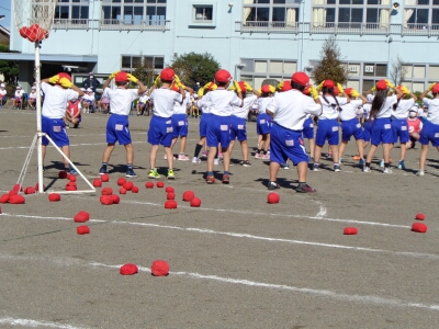 1年生団体「ちぇっこり玉入れ」では、玉入れの他にかわいらしく踊る姿も注目でした。