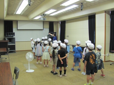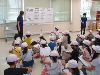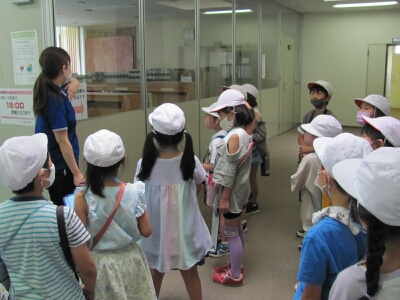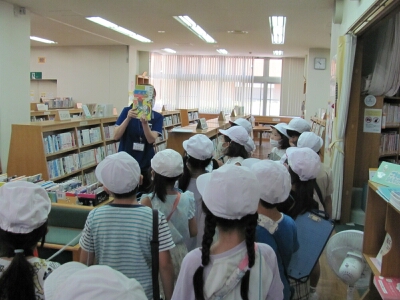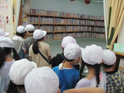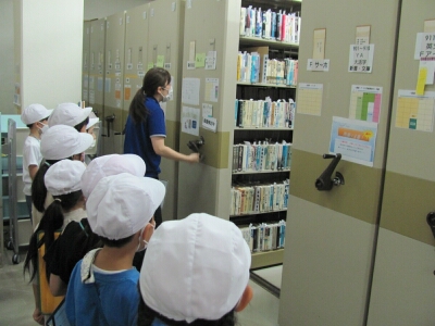 見学は、クラス毎に行いました。子供向けの本が並んだ本棚や大人向けの本が並んだ本棚、閉架図書の動く本棚など、図書館について説明していただきました。また、人気の本やおすすめの本も教えていただきました。