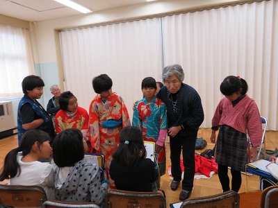 上小の周辺の昔の地図を書いて説明してくれたり、遊び道具を持ってきて一緒に遊んでくれたり、おばあちゃんが子供の頃に着ていた着物や使っていた道具を見せてくれたりしました。