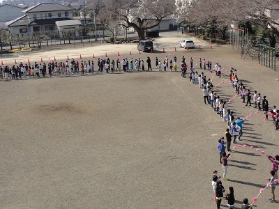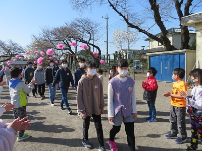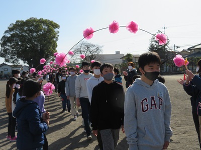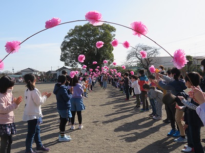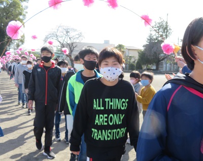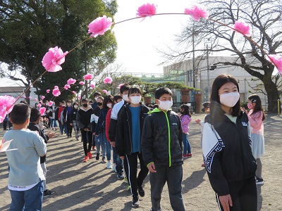 校長先生を先頭に、1組から順番に花のアーチをくぐります。