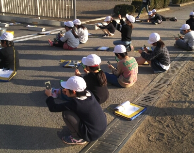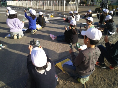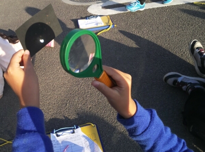 虫眼鏡で太陽の光を集めて、紙を燃やす実験を行いました。