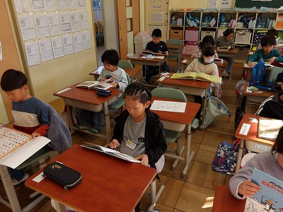 朝の時間は読書タイムとなり、図書室で借りた本を読んだり、先生が読み聞かせをしたりして、様々な本に親しみました。