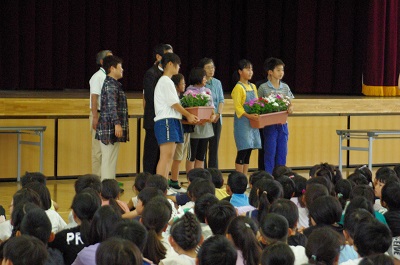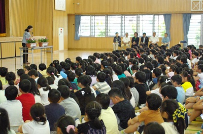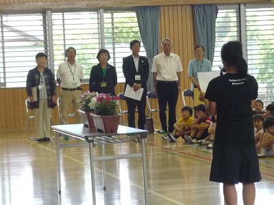 その後、代表児童からお礼の言葉があり、校長先生から「鉛筆もいただいたので、名前を書いて大切に使ってください。」と、お話がありました。