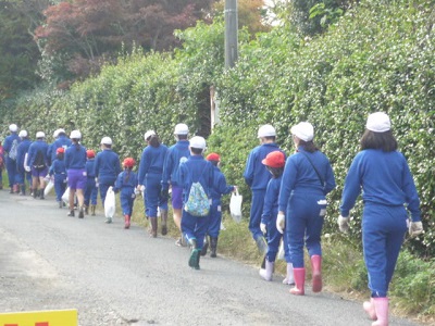 まず、なかよし班の1年生と6年生がペアになって農園に向かいます。