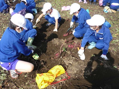 1年生と6年生が力を合わせて、大きな芋を掘っています。