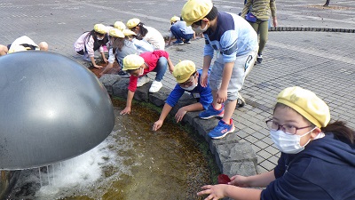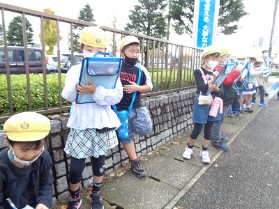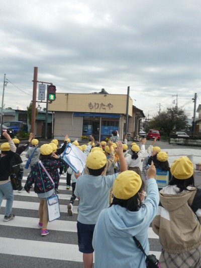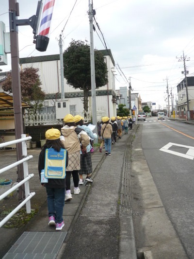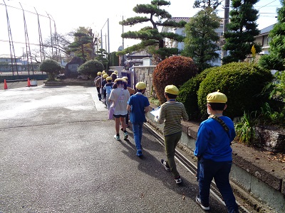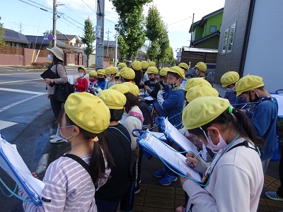生活科「もっと知りたい たんけんたい」の学習で、学校周りをクラスごとに歩いて見学しました。