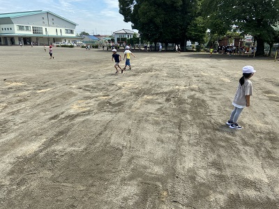 整地されて平らになった校庭で、子供たちが楽しそうに遊んでいます。校庭は車両進入禁止としたので、安心して過ごすことができます。