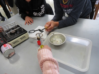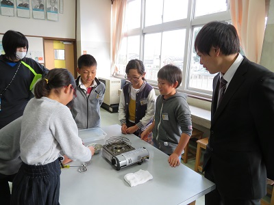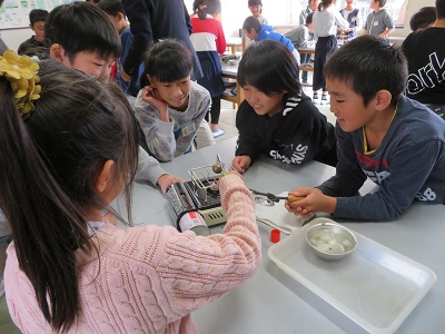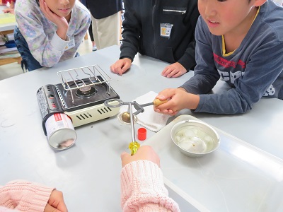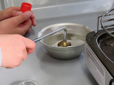 この日は、4年生の理科の授業で、「金属は温めると体積はどう変化するのか」という実験をしていました。丸い金属を温めると、はじめは通っていた穴に通らなくなります。再び、氷水で冷やすと、また、穴を通るようになりました。そこで、さらに冷やすと、金属の体積はもっと小さくなるのか、中学校の理科専門の先生に聞いてみました。「やってごらん」と、促され、さらに冷やしていました。