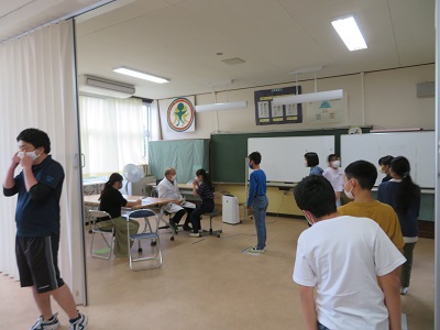 感染症予防のため、距離を取って並び、自分の手で目を開いて見せます。