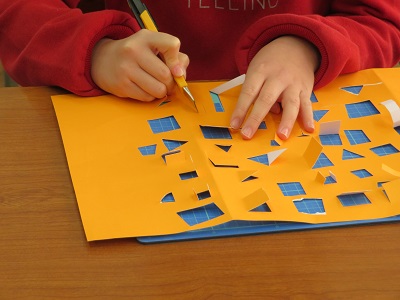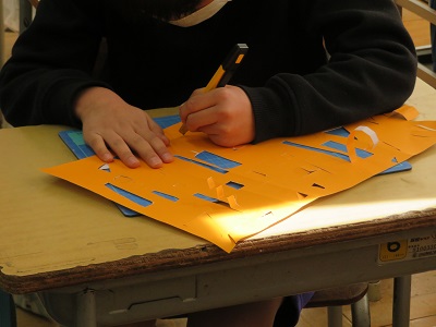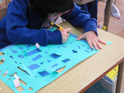 2年生がカッターナイフを使って、色画用紙を切ってタワーを作っています。