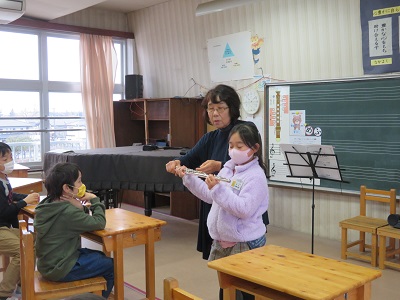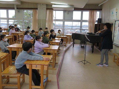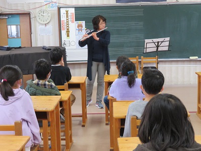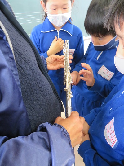 美しいフルートの音色を聴かせてもらい、楽器に興味をもった児童がたくさんいました。