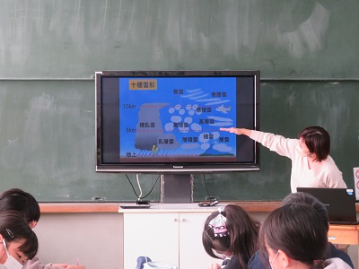 本校の保護者で気象予報士の方が、雲や台風、天気図、天気予報についてお話をしてくださいました。