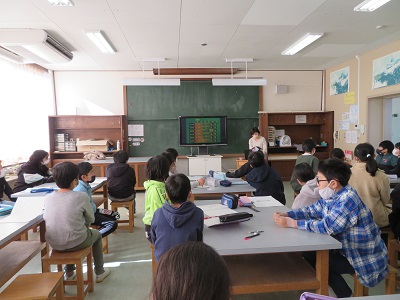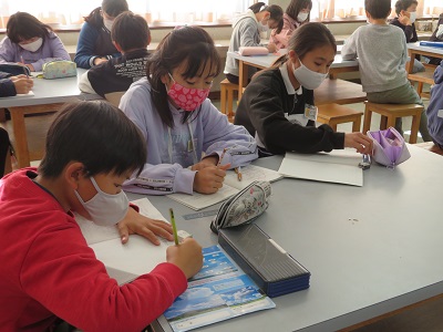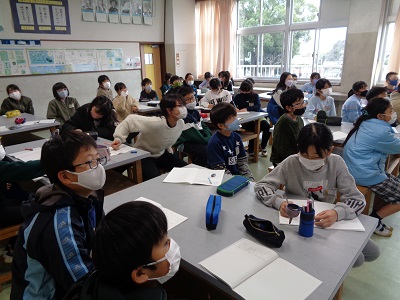 気象予報士の方のお話を身を乗り出して聞いたり、熱心にメモをしたりしていた5年生。