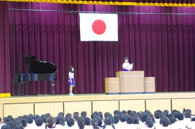 国歌斉唱後、年2生と4年生の代表児童の作文発表がありました。