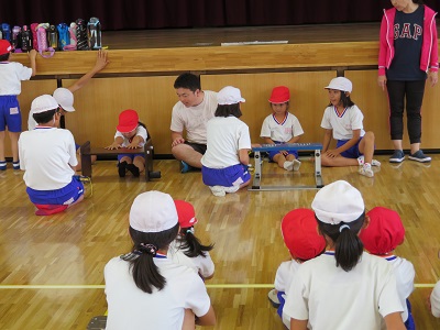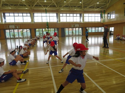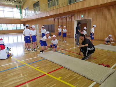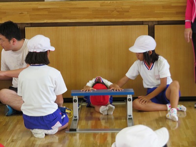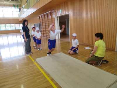 50m走ソフトボール投げ反復横跳び20秒間で何回できるか、2回測定しよい方を記録します。長座体前屈立ち幅跳び2回行い、よい方を記録します。 このほか、上体起こしを行いました。