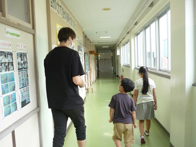 お迎えの2年生が教室まで案内しています。とっても背が高い先生です。