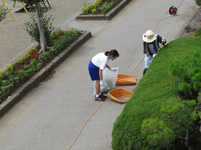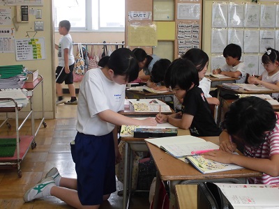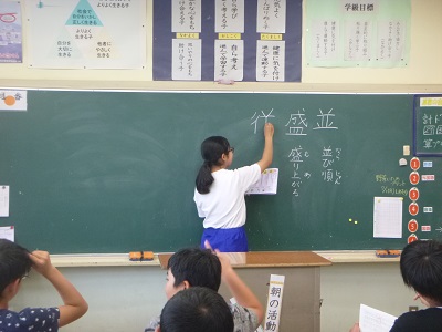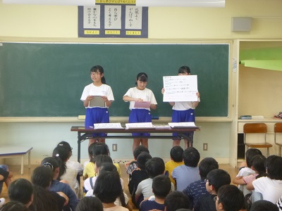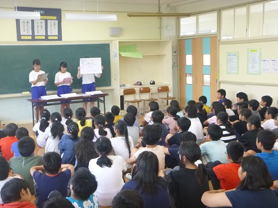 実際に文字を教えたり、学習の補助をしたり、環境ボランティアの方と校内の掃除をしたり、給食を食べたり、休み時間に子供たちと遊んだりとたくさんの経験をしました。最後の日には、6年生に中学校の生活や授業、部活の様子などを発表しました。