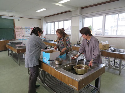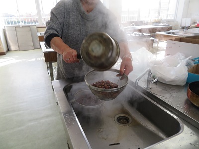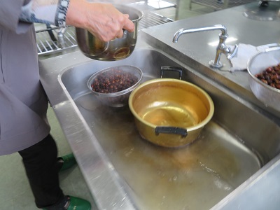 1年生がおもちゃを作るために集めたどんぐりを、虫が出ないように、上三川町商工会女性部の方が煮てくれました。